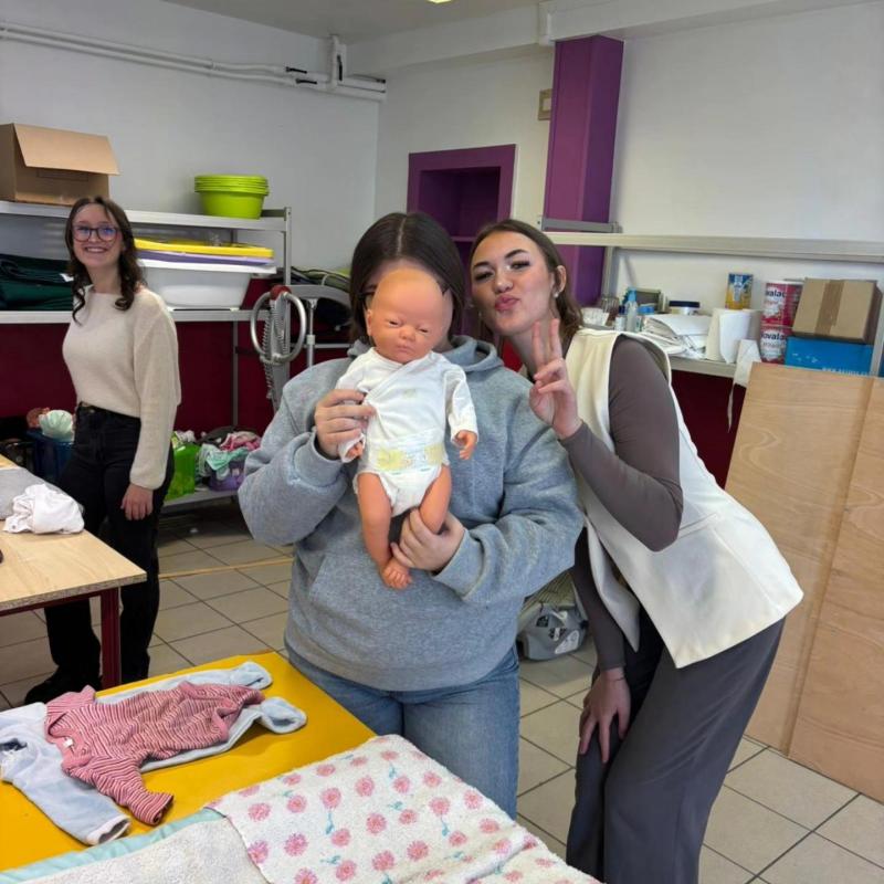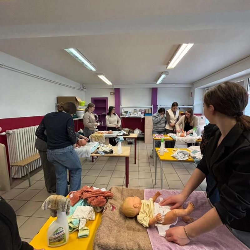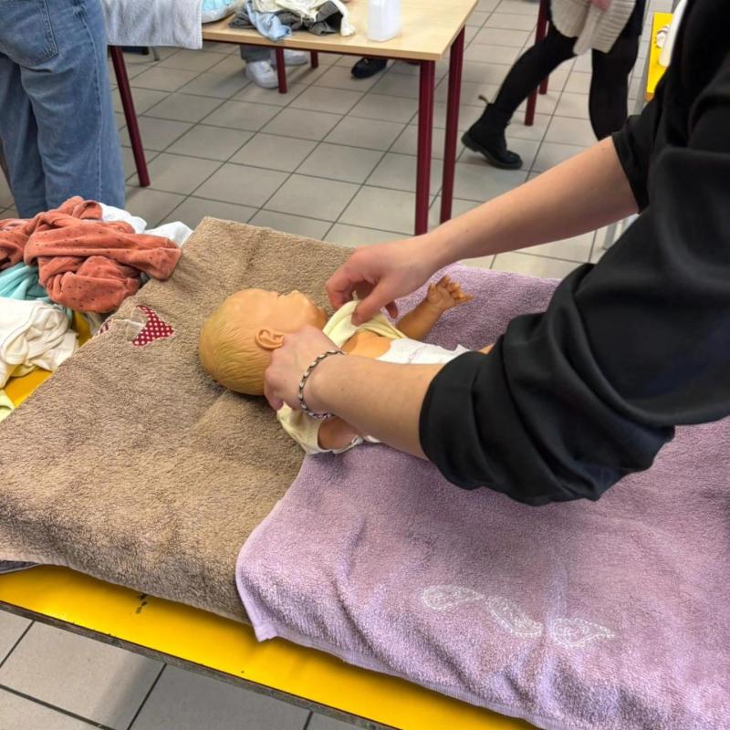 Nos élèves de 1ère Bac Pro SAPAT ont troqué leurs stylos contre des couches et des biberons... et disons que l'ambiance était "animée" !