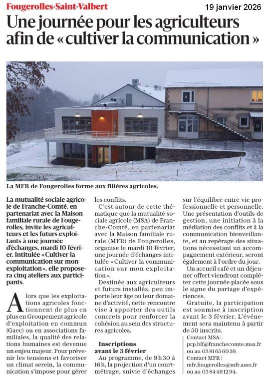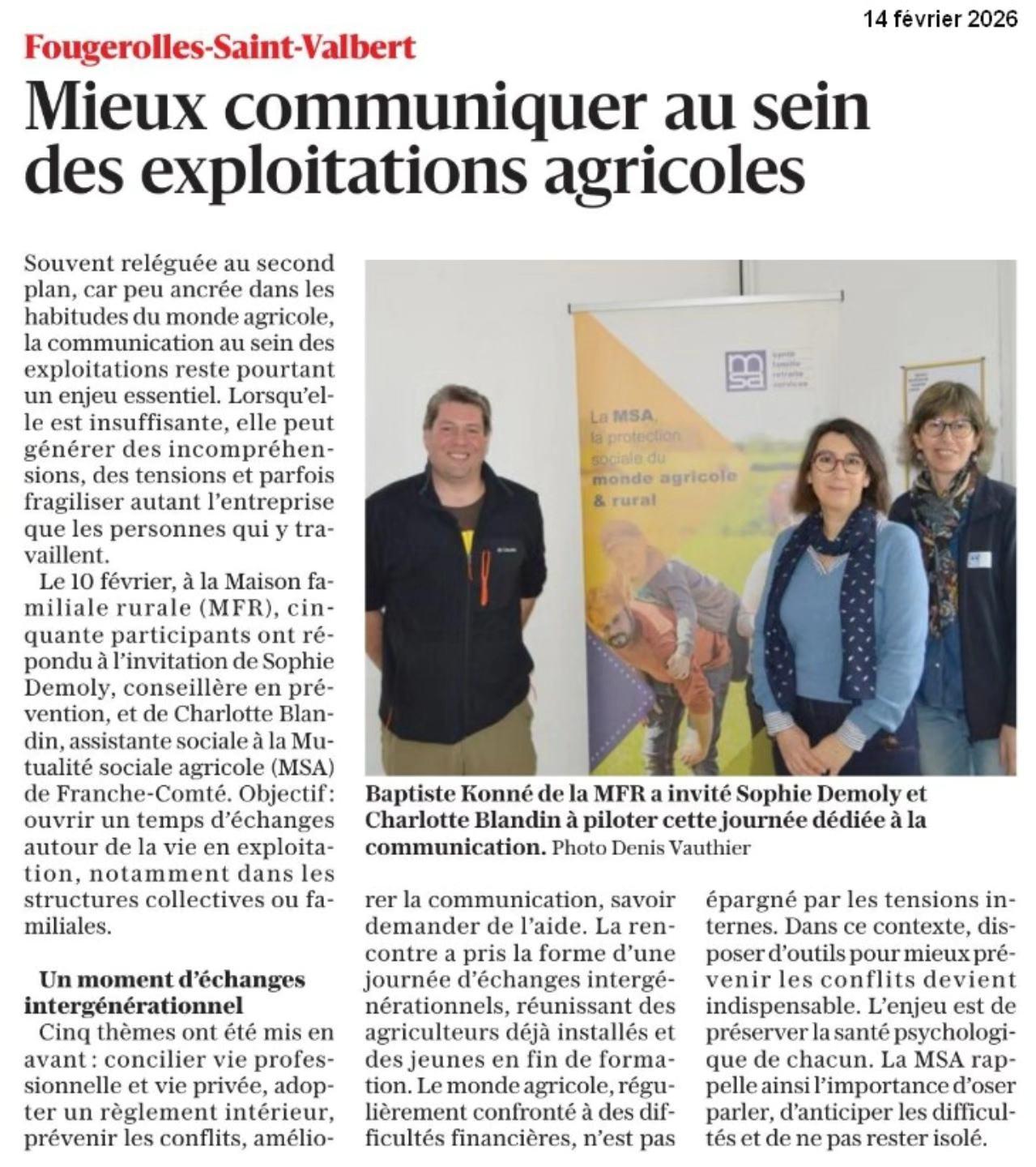 La MSA de Franche-Comté, en partenariat avec la Maison Familiale Rurale de Fougerolles, organise le mardi 10 février 2026 une journée d’échanges intergénérationnels et d’informations destinée aux agriculteurs et futurs installés. L’événement se déroulera de 9h30 à 16h00 à la Maison Familiale de Fougerolles (54 Blanzey).