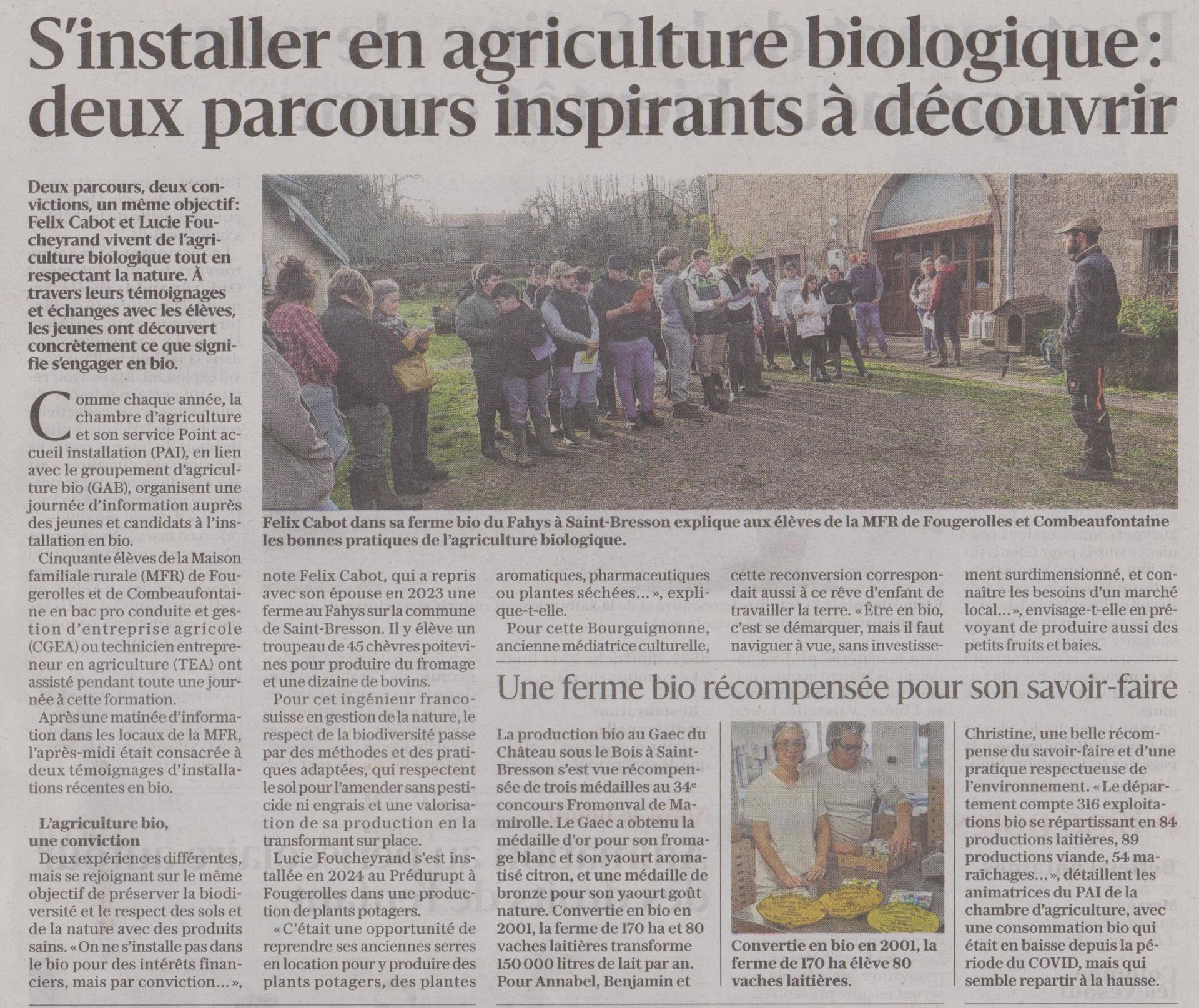 Ce sont une cinquantaine d’étudiants des MFR de Fougerolles et de Combeaufontaine, rejoints par des porteurs de projet des environ de Fougerolles qui se sont retrouvés lors de la journée « Demain je m’installe en Bio », organisée par la Chambre d'agriculture de Haute-Saône et le GAB 70 (Groupement des Agriculteurs Bio).