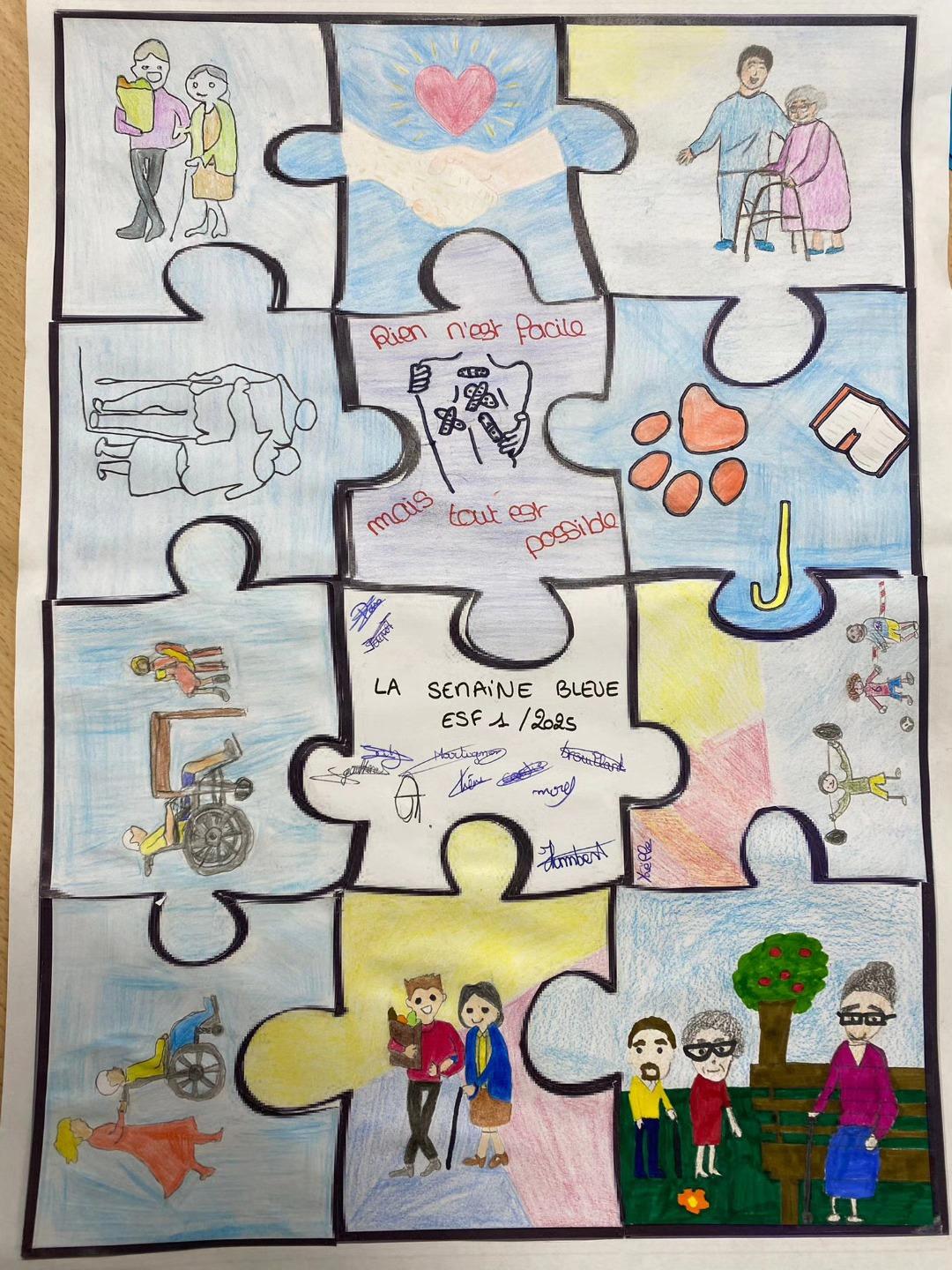 - Ils ont réalisé un puzzle commun, inspiré des codes graphiques de l’affiche nationale, pour réfléchir aux forces et richesses de nos aînés : la transmission, la bienveillance, la mémoire, la résilience, et tant d’autres valeurs..
